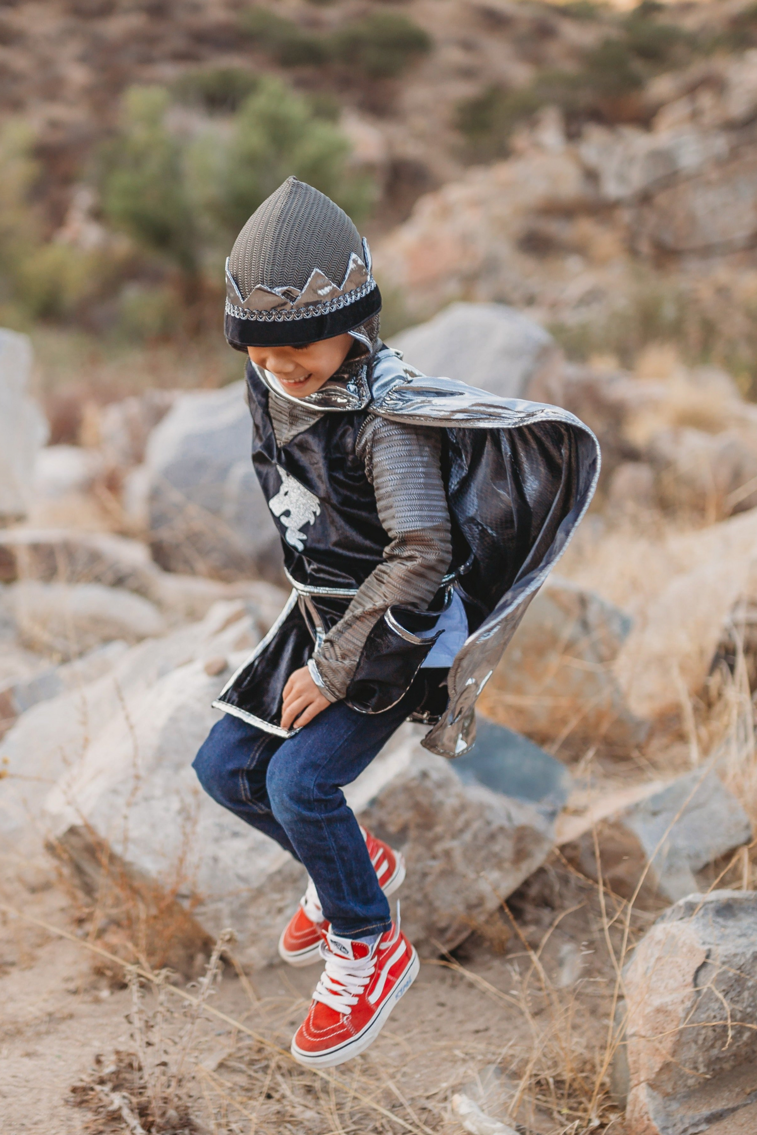 Be off to fight the good fight with this amazing 3 piece gold hooded knight set. This set includes a hooded tunic, knight cape, and gold or silver knight crown. A glitter lion emblem is embellished on the front of a black velour tunic with chainmail-like fabric for the hood and long sleeves.