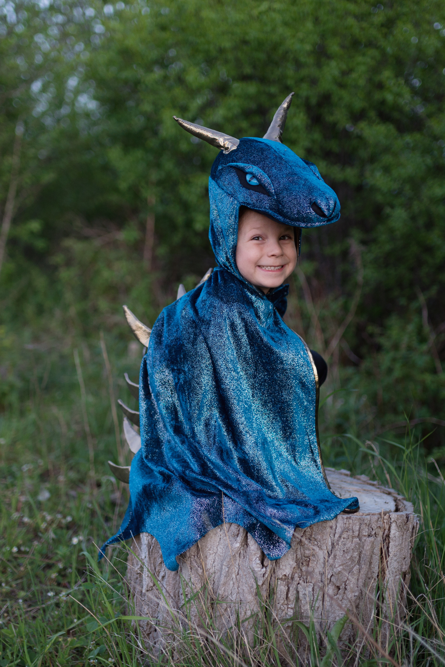 This gorgeous cape is fearless with its spectacular fiery blue eyes, dramatic golden spikes and horns, and a stuffed head with great design details. This cape will get your little one ready for countless hours of exciting playtime and fantasy-filled adventures! The fabric is soft, comfortable, and designed to look like a mysterious midnight blue sky with sparkles imitating millions of stars in the sky! This is the ultimate cape to encourage creative and imaginative play, and it’s of course machine washable.